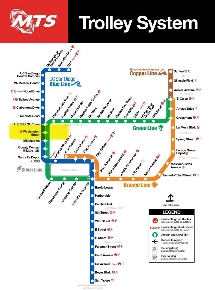 2 block walk to the Washington Street San Diego trolley station. Walk to Old Town. Walk to Hillcrest and Mission Hills.
